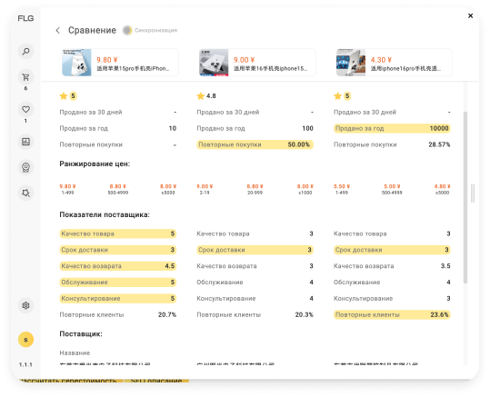 В платной версии вы можете сравнивать товары в одном окне, удобно оценивая цены, характеристики и рейтинги поставщиков.